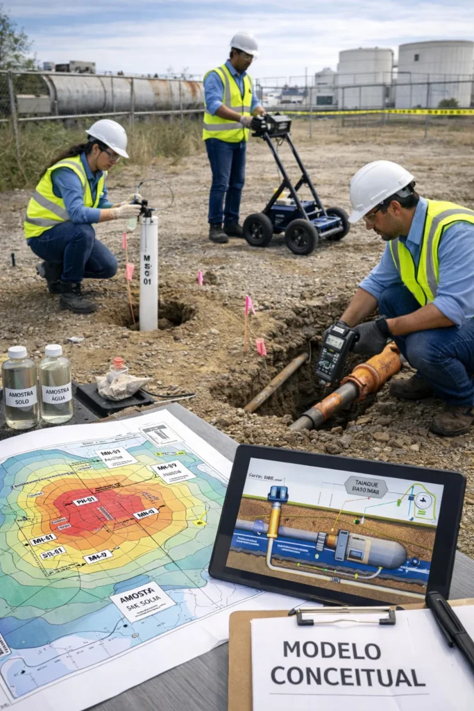 O objective dessa etapa de diagnóstico é definir os limites dos impactos ambientais em cada meio afetado e as características físicas de cada meio que influenciam a movimentação/migração das contaminantes. Existe um grande variedade dos métodos investigativos que podem ser aplicados em conjuntos para facilitar as atividades de investigação, o escolha do que depende nas caracteristicas físio-químicos dos SQIs sendo investigados e as características específicas físicas antecipadas no site, inclusivamente, a presença dos instalações subterrâneas que podem representar caminhos preferenciais de migração. A distribuição dos pontos e profundidades de investigação e amostragem também depende nesses fatores antecipados, porém devem ter flexibilidade de redistribuição durante o andamento do projeto enquanto informações reais estão sendo gerados, resultando no maior grau de eficiência nas atividades de investigação. Essa etapa de investigação deve ser feito em duas ou três levas (inicial, complementar e suplementar) para otimizar o enfoque das atividades de investigação e minimizar a quantidade dos pontos mal posicionados.