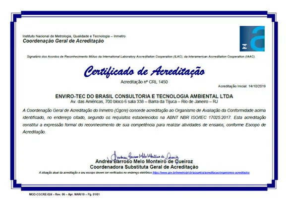A ENVIRO-TEC possui sua acreditação No. CRL 1450, autorizada pela Coordenação Geral de Acreditação do INMETRO desde 2019.